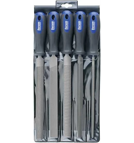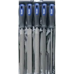 5-teilig, in Rolltasche, bestehend aus je 1 Stück Werkstattfeile mit Kunststoffheft flachstumpf, halbrund, rund, dreikant und Holzraspel (halbrund).