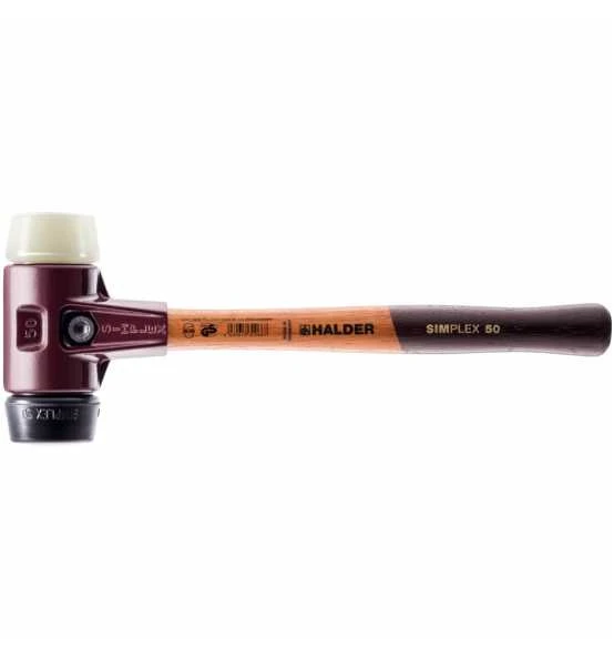 - SIMPLEX–Schonhammer in der Einsatzkombination Gummikomposition (schwarz, mittelhart, dämpfend, geruchsneutral, verschleißarm) / Nylon (weiß, hart, sehr verschleißfest, kein Absplittern auch bei Minustemperaturen, öl- und fettbeständig)..
