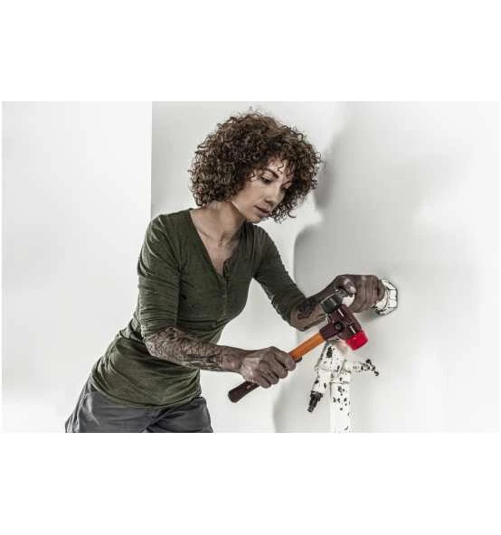 - SIMPLEX–Schonhammer in der Einsatzkombination Gummikomposition (schwarz, mittelhart, dämpfend, geruchsneutral, verschleißarm) / Plastik (rot, hart, öl- und fettbeständig).