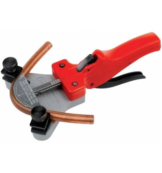 Einhandbieger zum maßgenauen Biegen bis 90°, mit Biegesätzen im Stahlblechtragekasten. Maßgenaues Biegen auch in Zwangslagen, mechanischer Ratschenvorschub, Überbögen, Gegenbögen, Etagenbögen und Anschlussbögen in allen Ebenen möglich. Biegesegmente durch Bajonettverschluss leicht auswechselbar. Zum Biegen von weichem Kupfer- und Aluminiumrohr, weichem, ummanteltem Kupferrohr, weichem Präzisionsstahlrohr.
